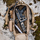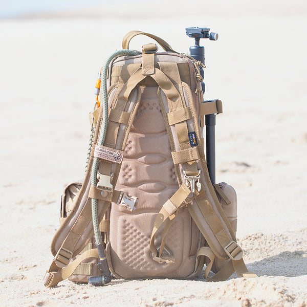 _ side elastic-topped-pockets for water bottles, knives, etc.