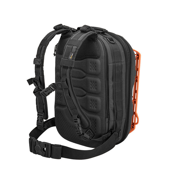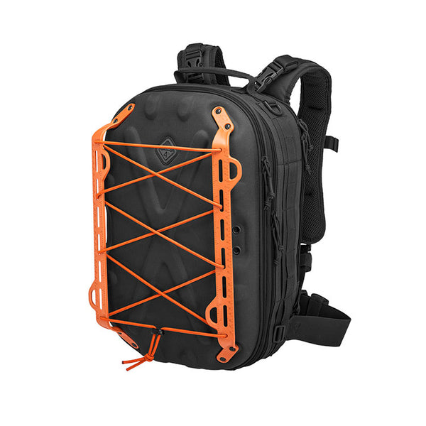 This new breed of rugged pack protects optics, electronics and even weapons, by marrying light molded-foam shells and 360 padding for demanding users like press, military, vloggers, surveyors, investigators, etc. The striking aesthetics project an image of the owner at the leading edge of technology. The compartments will fit a laptop, tablet, pro camera systems, drones like Mavic Pro, accessories like card-readers, and personal items like snacks, rain shell, or first aid kits that are often not allotted on most packs. The molded back-pad is abrasion resistant while conforming to the spine and ventilating sweat. The top shell has 6 spots for our patented Hardpoint® parts allowing optional attachment of loops, lights, bungee systems, molle panels, etc. This pack is also very suitable for motorcycle use as it won't flap in the wind. Military modular webbing (MOLLE) is provided throughout on the sides, straps, and the interior is lined with fuzzy panels to allow expansion with pouches, hook-backing i.d. patches, etc. YKK® Zippers, genuine Cordura® 1000D nylon (gray models are Polyester), and reinforcing stitch patterns insure lasting quality.