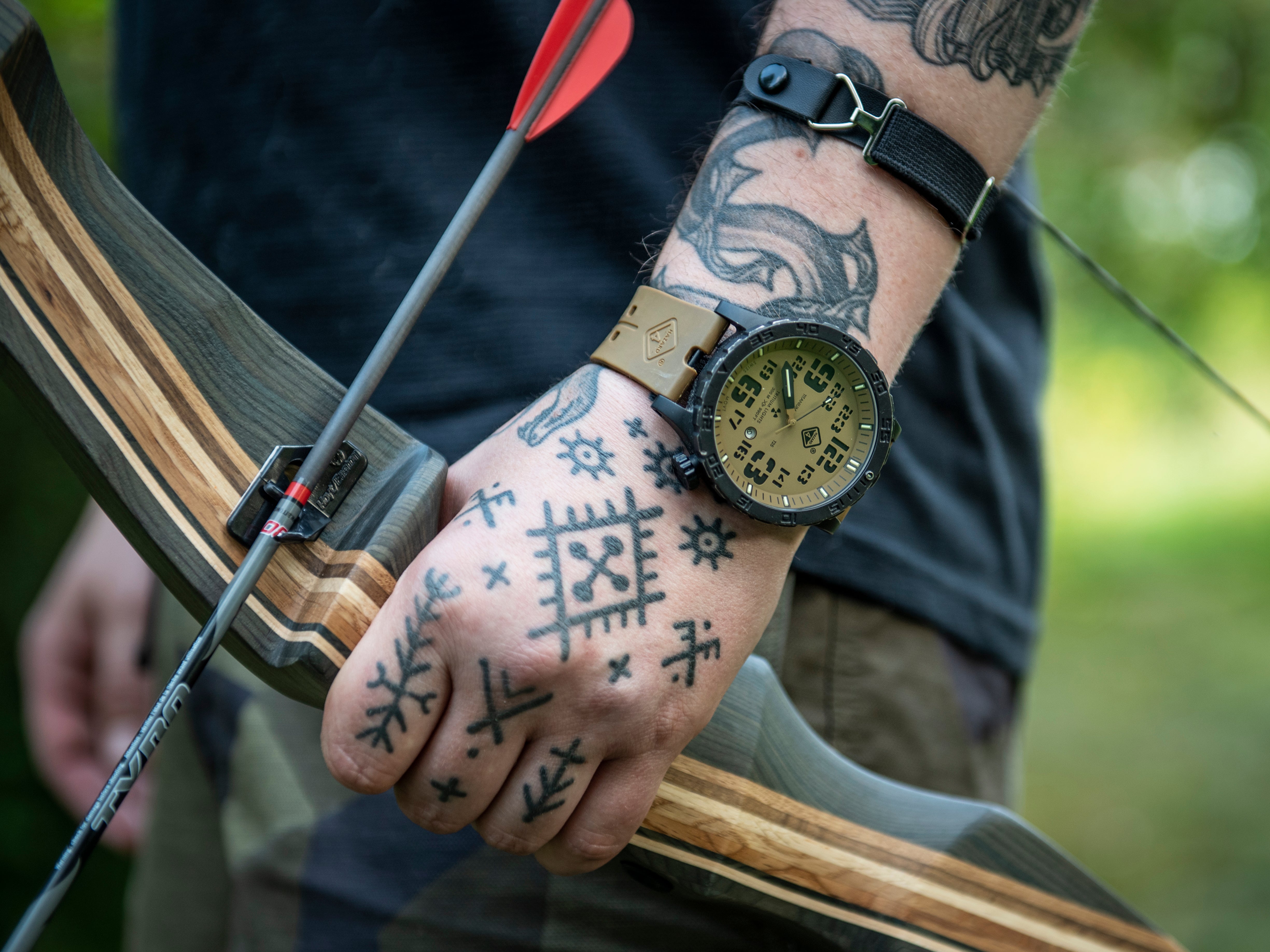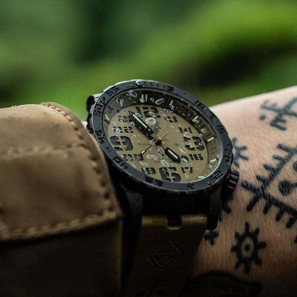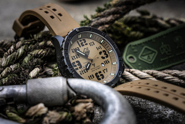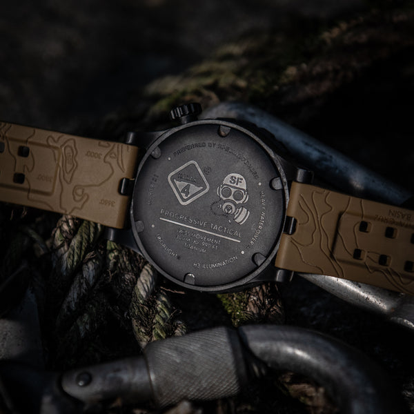 Hazard 4® Heavy Water Diver® watches glow continuously using self-powered tritium (H3) Swiss mini-lamps like in your pistol night sights - won’t fade overnight like luminescent paint. A Swiss-movement guarantees reliable accuracy. Built with 100% titanium, this 50mm large watch is only 1/2 the weight, but double the strength of a steel watch. A proven dive watch, it is water resistant to 300M / 990 FT depth. The unique, bold, military styling features easy-to-read numerals and our exclusive integrated 24-hour scale. The submarine-inspired aesthetics carry into the precision, 60-click uni-directional dive bezel topped with tritium zero indicator and the easy-turn screw-down crown. The face numerals are 3D stencil 2-layer design which along with angled chapter ring makes it not only tactical, but also a sophisticated timepiece suitable for the office or formal event. Available in an unprecedented range of tactical and urban oriented colors/finishes - they come equipped with a variety of straps and bracelets. Used in the most extreme environments by special forces, explorers, and professionals worldwide, it won’t let you down and makes an unforgettable formal present.