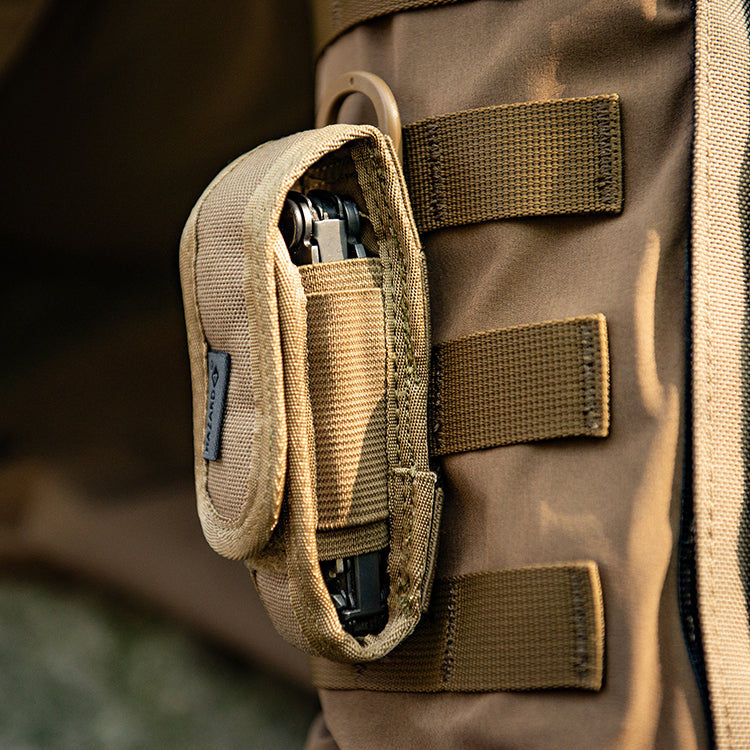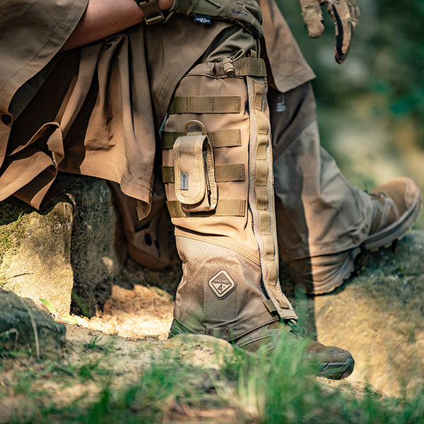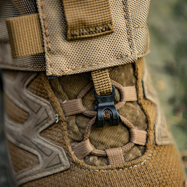 Patent Number: US D1,012,441 SWhether you're hiking or mountaineering, etc., water repellent stretch Mandogator™ works in tandem with your boots to protect your foot and lower leg from deep snow, wet underbrush, or debris that can be picked up (like snow getting into the top of your boots). Modular MOLLE webbing on the sides allows the addition of pouches (sold separately) for carrying lights, knives, tourniquets, etc. One can quickly access their pouches and gear in cramped places, while non-metal design eliminates typical and problematic metal snaps, rivets, and hooks. There is no rust, no deformity, no mine-trip - also easily walk through metal detectors (police, military).