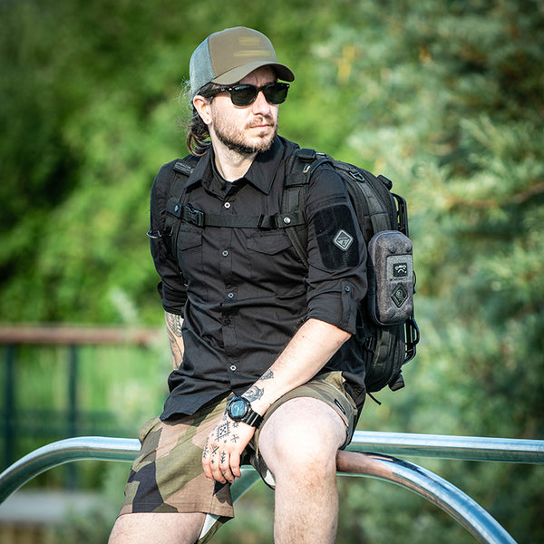 The Colonial™ is our modernized redesign of the standard safari shirt. Features include a more tailored fit patterning and stretch cotton blend for superior movement/durability. Sleeve patches are included for i.d.'s with flat pockets below plus 2x front utility pockets. Another simple but progressive innovation from the design team at Hazard 4®.