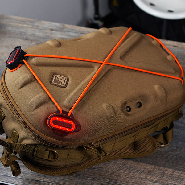 Rechargeable Beacon Light - Kit-B (red LED) screws into our packs/bags’ Hard Point® ports via its rubber boot/hardware. Molded loops and screw backer also allow mounting to cords, carabiners or ½” webbing. Add bright 100 Lumen visibility for bike/moto, jogging, hiking, or boating and for pro use like police, military, agency and industrial. One-button control cycles constant to 3 independent blinking/intensity modes. Constant mode is usable for reading maps, etc. (red light good for eyes' night vision.) If mounted facing to packs/bags interiors, these are a unique illumination of bag contents. Spun in the air on any cord as illustrated, these create a large, bright circular signal; a great option for rescue or rallying purposes. The side loops keep the light oriented to the observer without twisting away on the cord.