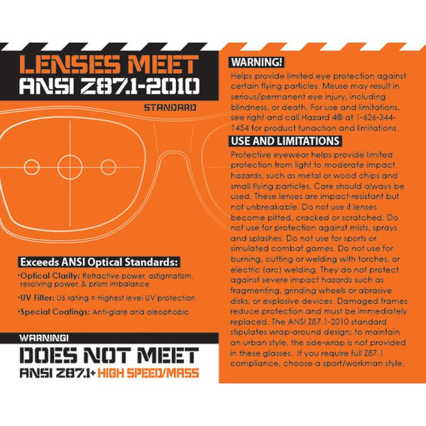 Standards: Lenses meet ANSI Z87.1-2010 Standard (Do not meet ANSI Z87.1+ High Speed/High Mass.)