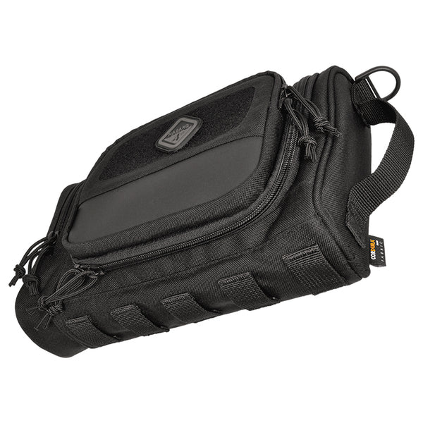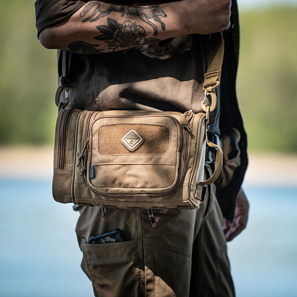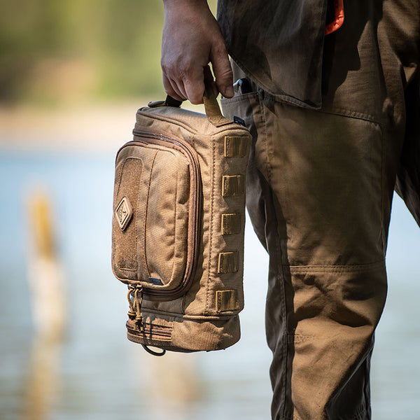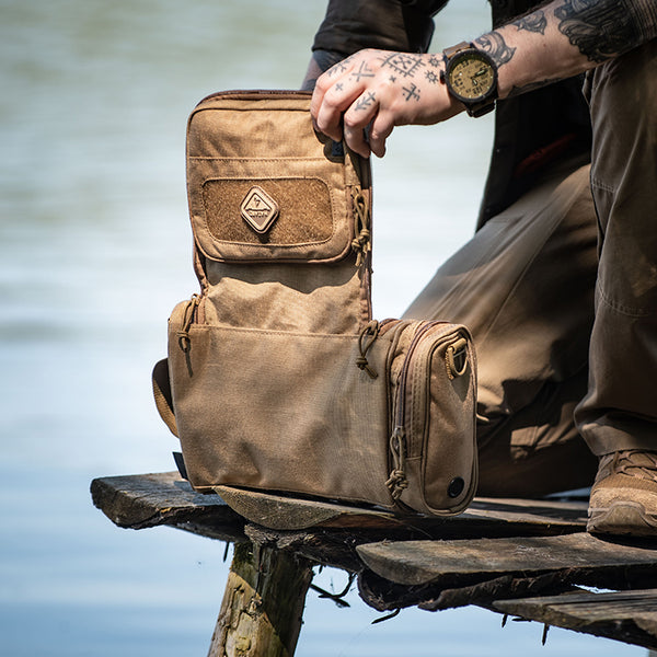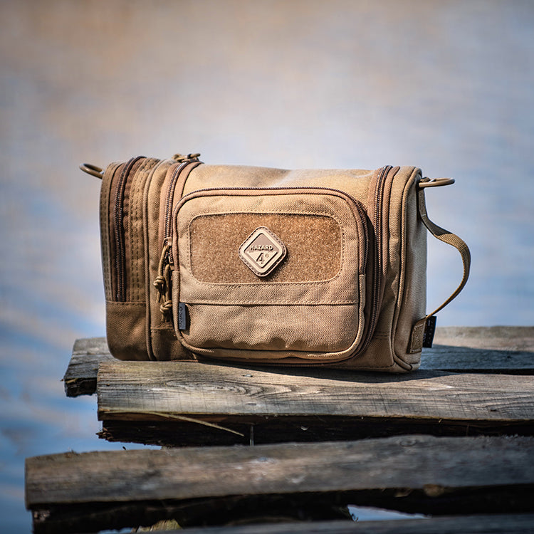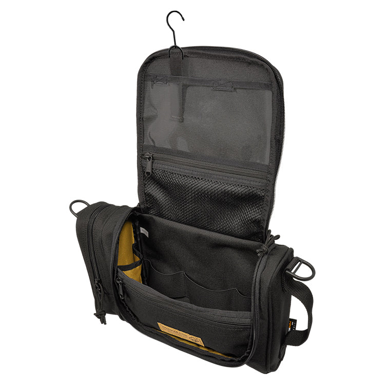Desert tent-encampments, makeshift military barracks, and 3rd world lodgings are the places for which this tough toiletry-bag was designed. But its progressive, rugged looks won't appear out of place on five-star hotel marble. Small pouches for shaving etc. have been around, but this military-grade, harsh-environment type is a first. Made with the same innovative features, and attention to detail as our larger bags, it will keep you civilized in the most dangerous spots on earth. It features a larger volume for prolonged deployments, a suspension swivel-hook to keep it off questionable surfaces, and internal organizers to keep contents from mixing/breaking. It even has a clear internal window for an optional mirror.